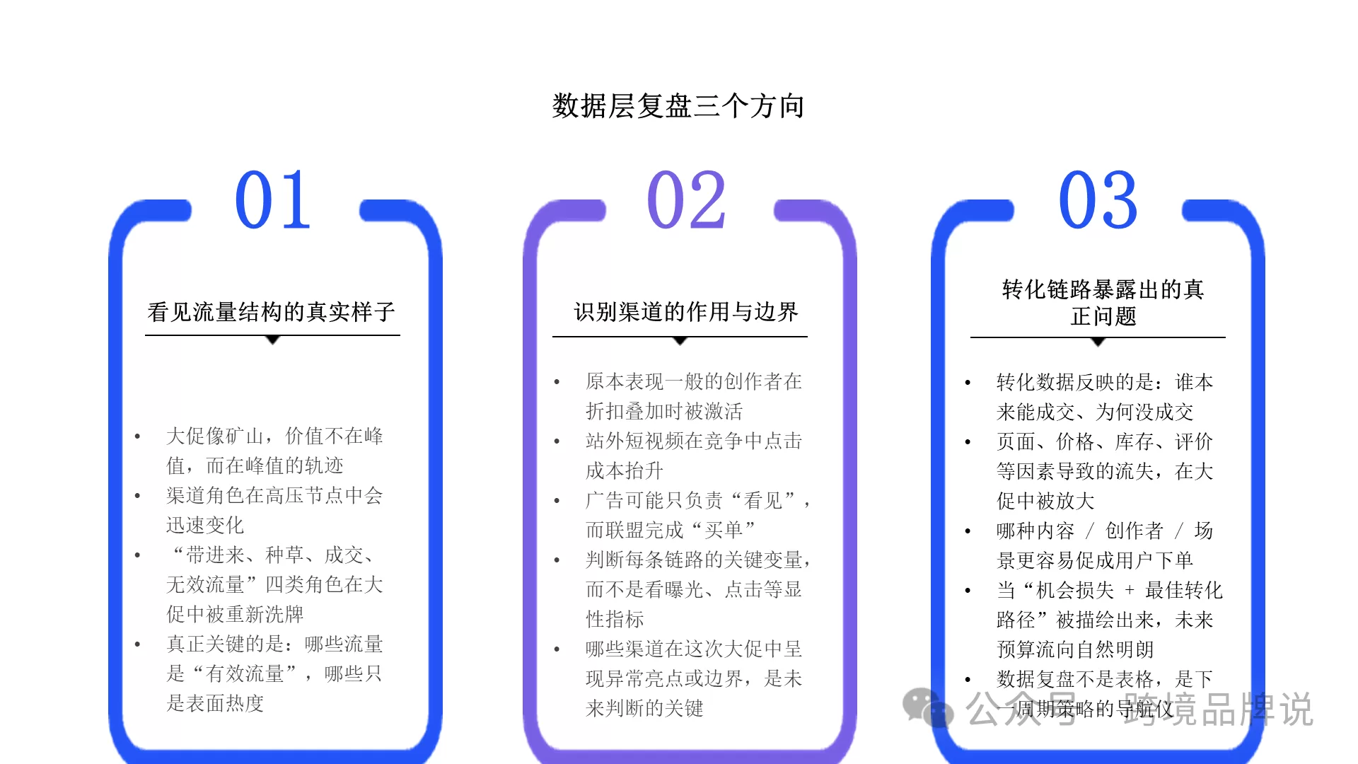 所以数据层复盘的核心,不只是看平台给了多少曝光、多少点击,