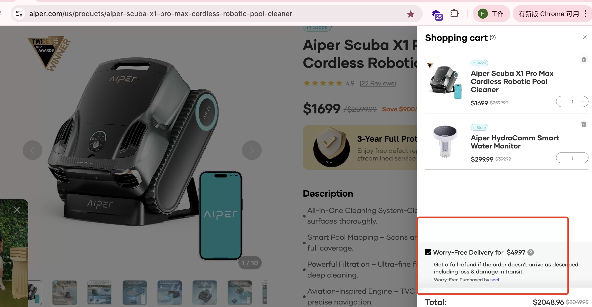 高价值的 Aiper Scuba X1 Pro Max 机器人泳池清洁器、Aiper HydroCom智能水质监测器,