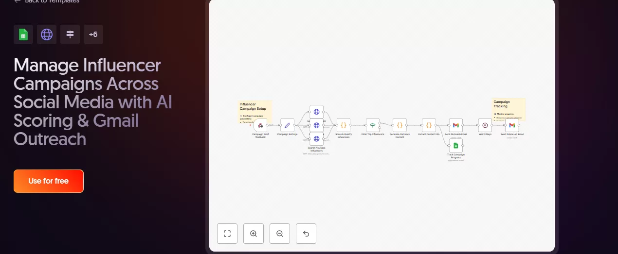比如找红人,不再是人工去Google、YouTube、TikTok 一个个平台搜,而是提前告诉 n8n: