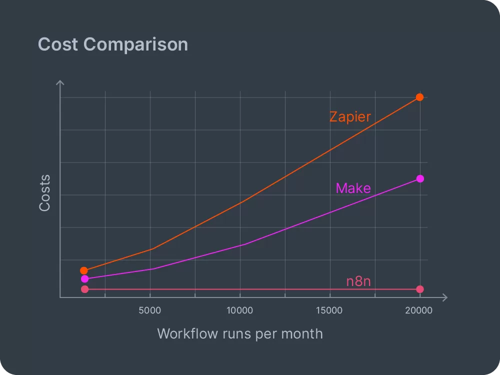 n8n官方在对比页强调:Make 往往把每一步、每个 API 调用都计入可计费操作,复杂流程成本会随复杂度陡增;