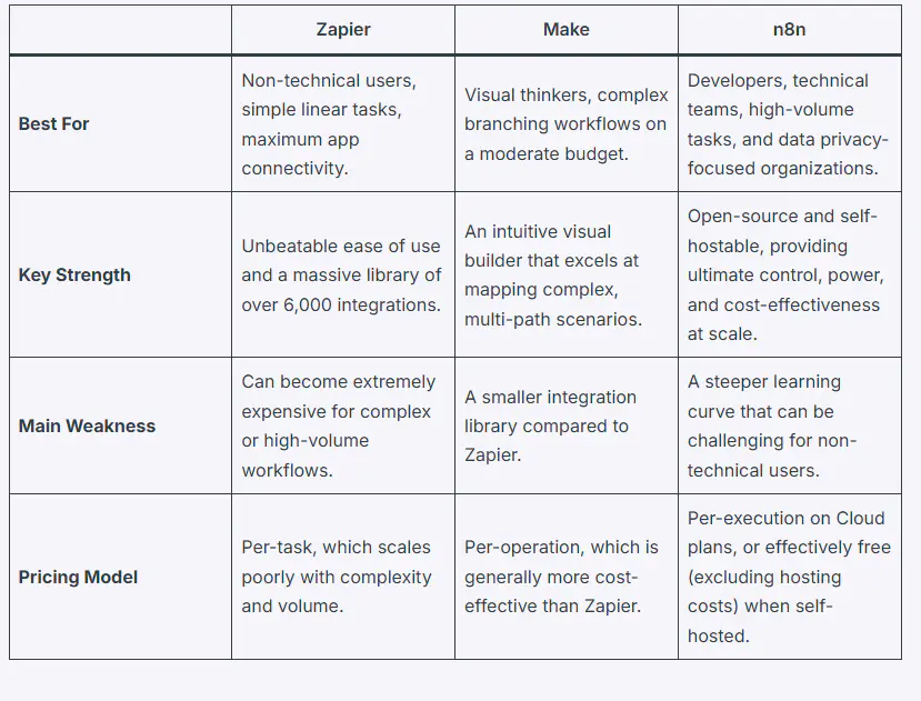 Zapier/Make 往往更“业务友好”,n8n 更“可玩性强”
